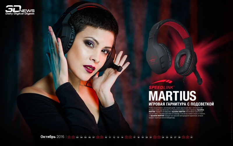 Героями этого выпуска календаря 3DNews стали наша прекрасная победительница Мила Рачич и игровая гарнитура с подсветкой Speedlink MARTIUS! Чтобы почувствовать настоящий драйв в энергичных играх, нужен идеальный звук с интенсивными басами. С этой задачей на все сто справится игровая стерео гарнитура Speedlink MARTIUS. Поворотный микрофон игровой гарнитуры Speedlink MARTIUS обеспечивает кристально чистую связь с вашими друзьями по команде. Регулировать звук и отключать микрофон можно быстро и удобно с помощью пульта управления, расположенного прямо на проводе гарнитуры. Если же вы любите играть в темноте, то Speedlink MARTIUS порадует вас красной светодиодной подсветкой, которая придает гарнитуре впечатляющий вид.